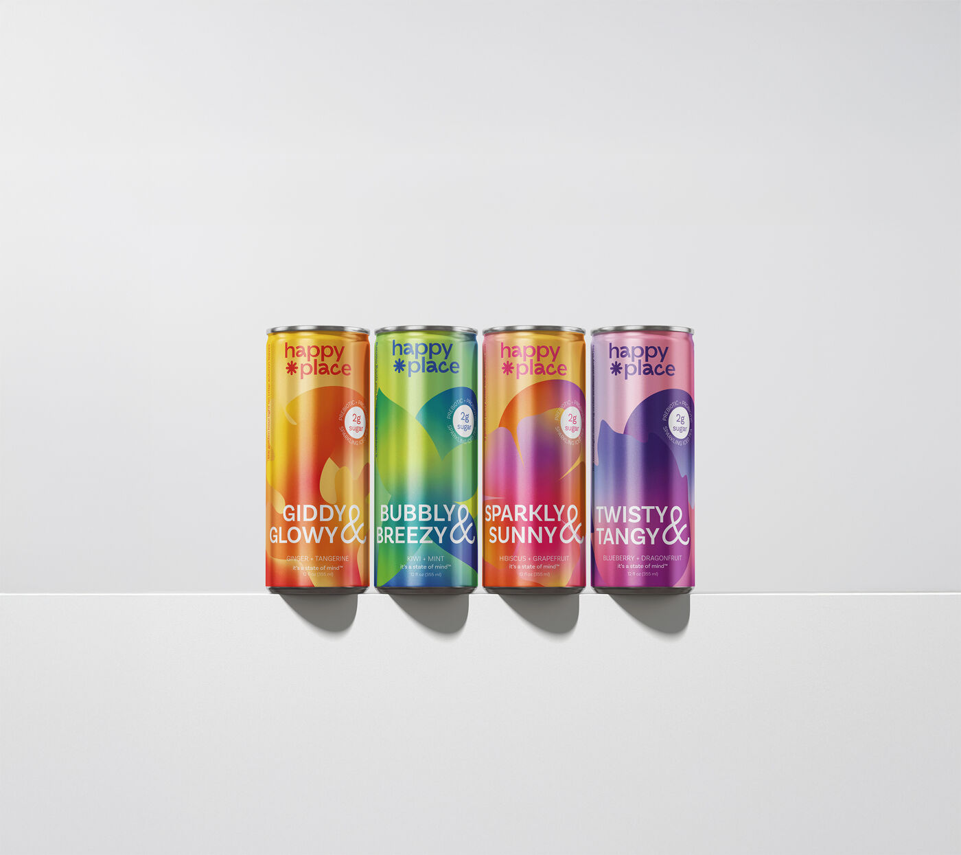 Emily Norris-Jones – Honourable Mention, Colour for Happy Place Beverage Packaging Brand, created in Dimensional Design with Anne Ahmad Burnett.
